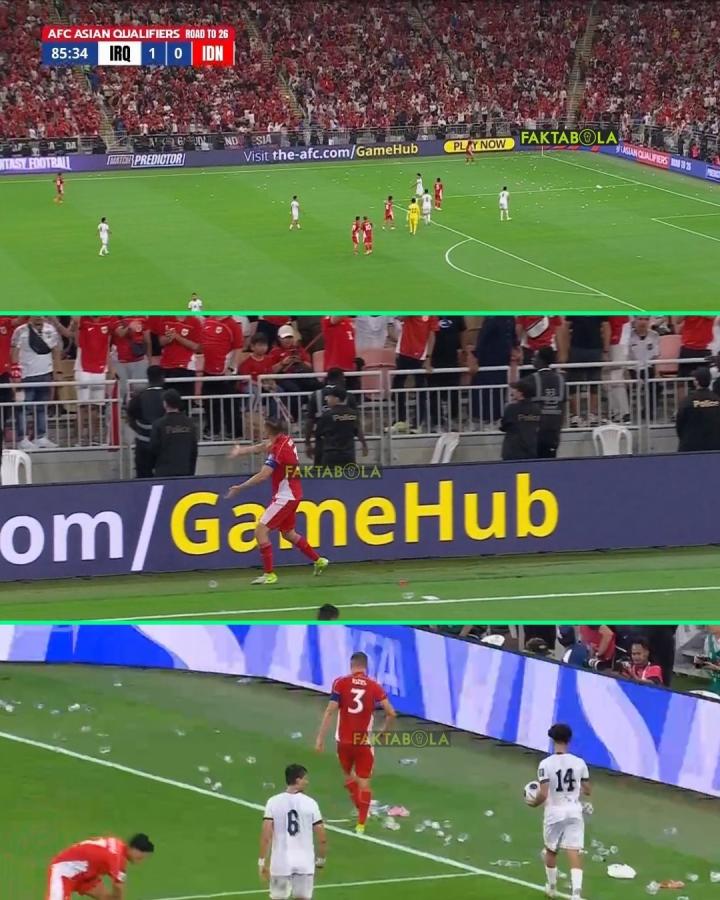 比赛进行到第85分钟(此刻印尼0比1落后),印尼球迷情绪失控,疯狂向场内投掷水瓶,角旗区附近瞬间被水瓶淹没,随后印尼队长伊泽斯挺身而出,喝止了这一过激行为。